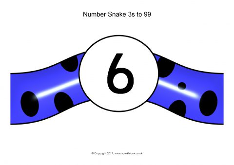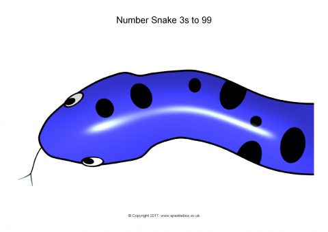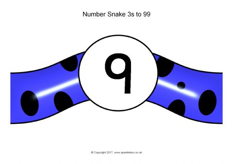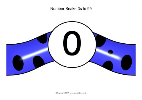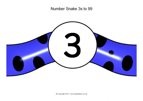 A large printable blue snake number track with the numbers in 3s up to 99.
