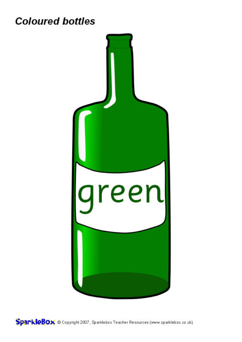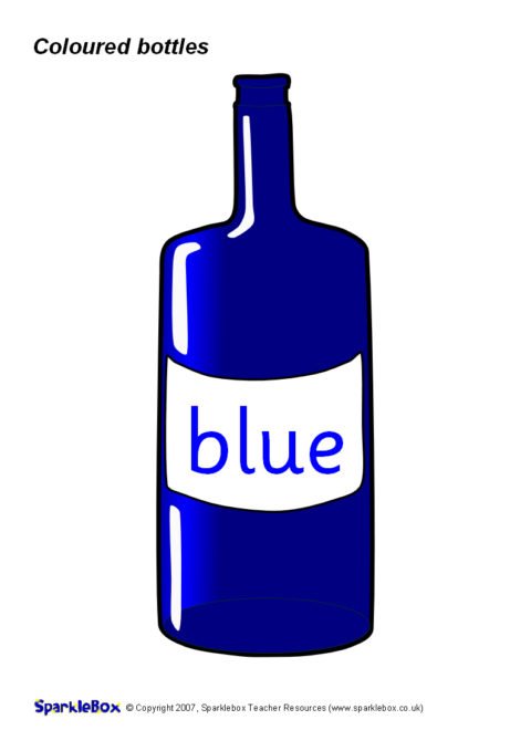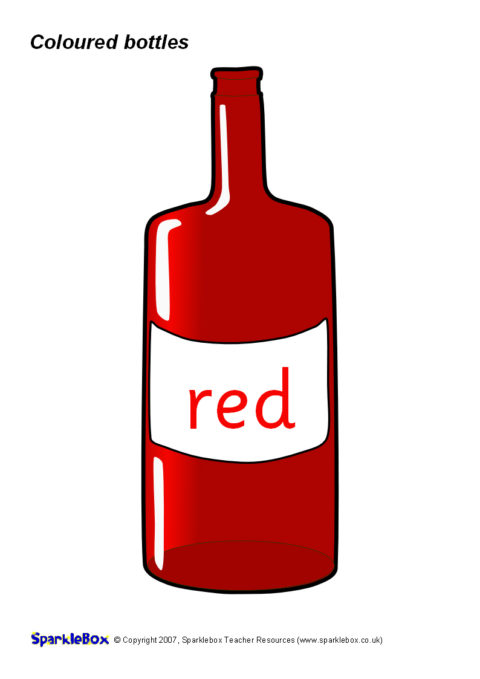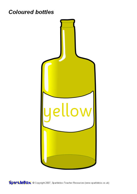 Different coloured bottles on A4 sheets with corresponding word labels.