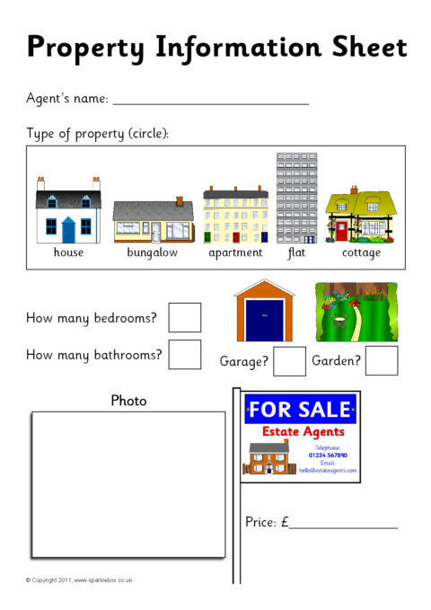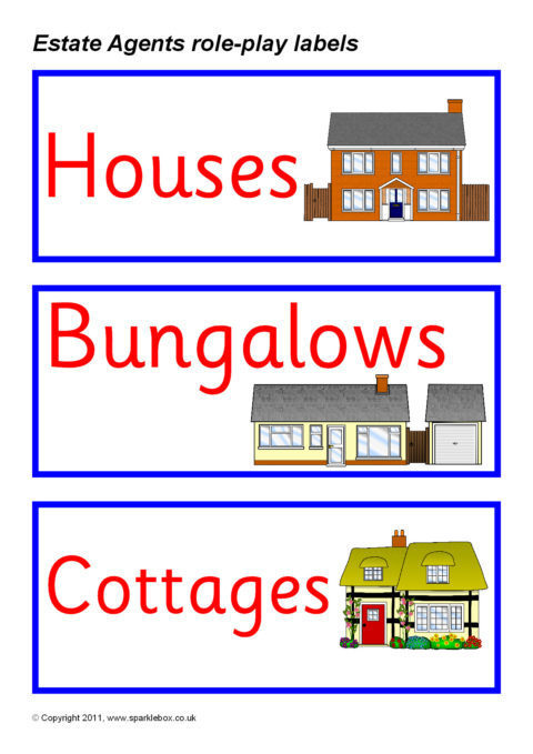 A set of printable signs, posters, labels and writing aids for your Estate Agents role-play area. The set includes a banner , ‘Property information’ form, labels and property information posters.