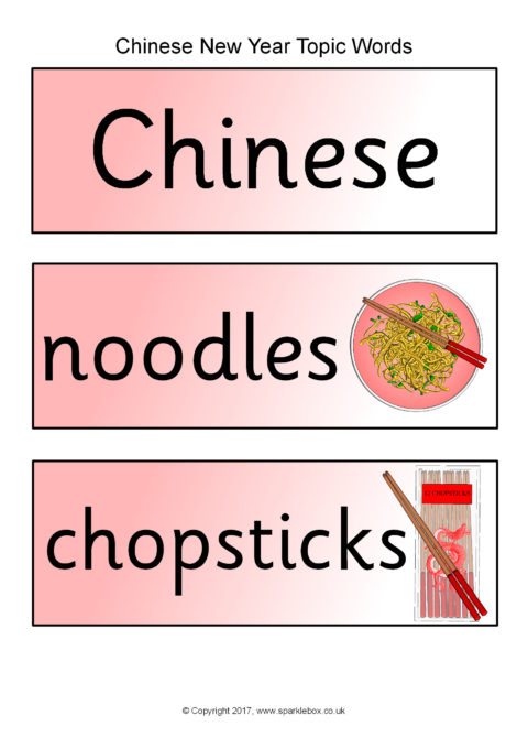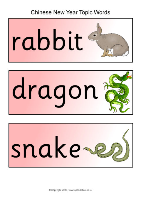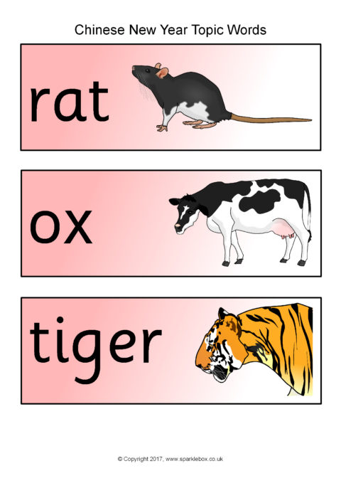 Set of printable word cards with accompanying pictures, linked to a topic on Chinese New Year. Includes the 12 animals of the Chinese Zodiac as well as some Chinese symbols and other useful words.