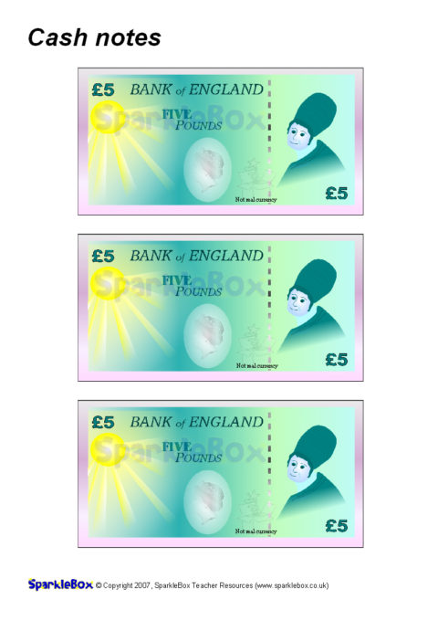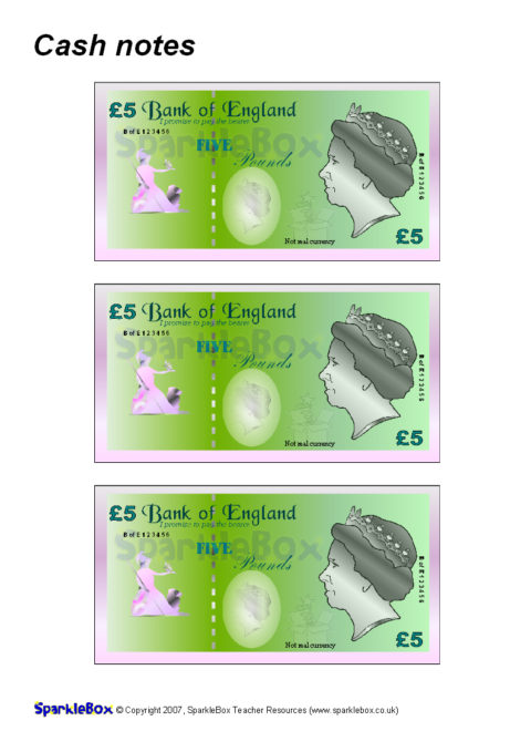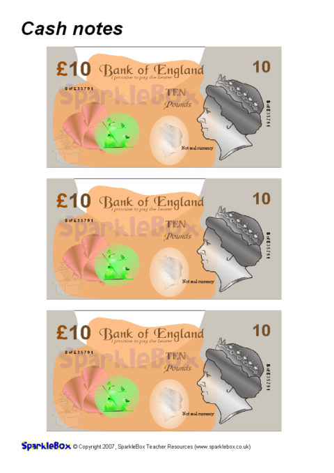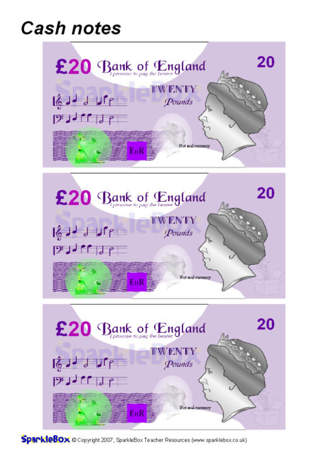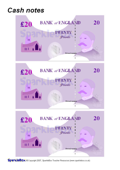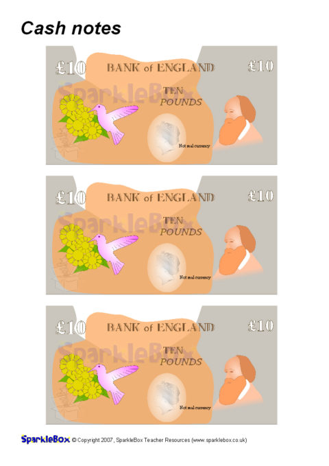 A set of printable £5, £10 and £20 notes great for use in role-play. Includes front and back of the notes to enable double-sided printing.