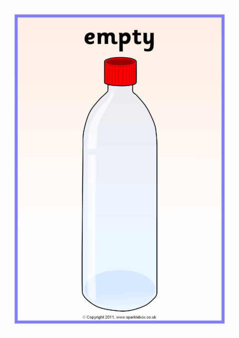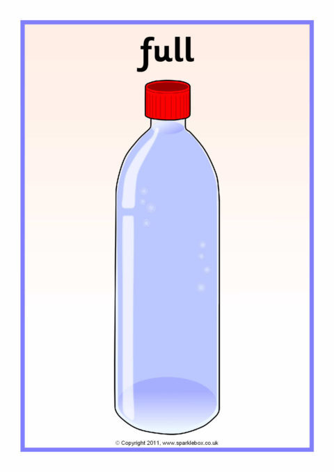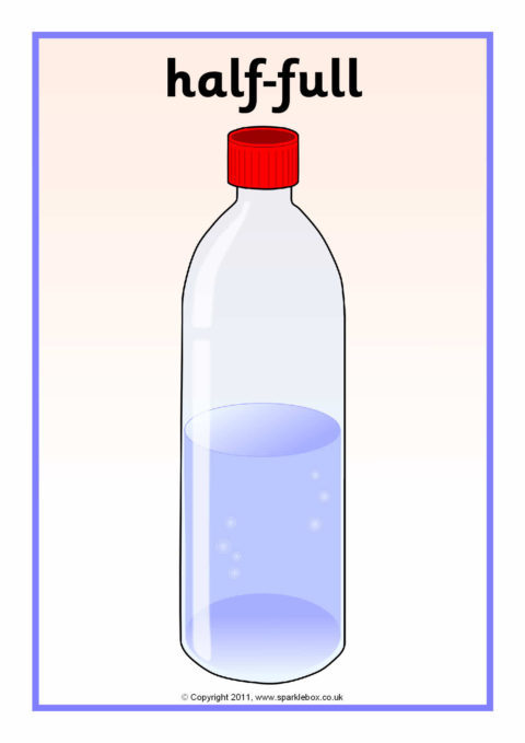 A set of printable posters showing a water bottle full, empty, half-full, nearly full and nearly empty.