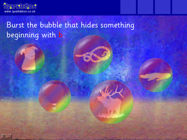 An interactive PowerPoint activity where children collect fish as they burst the bubbles containing things beginning with ‘b’.