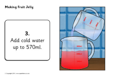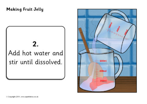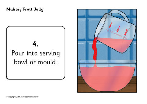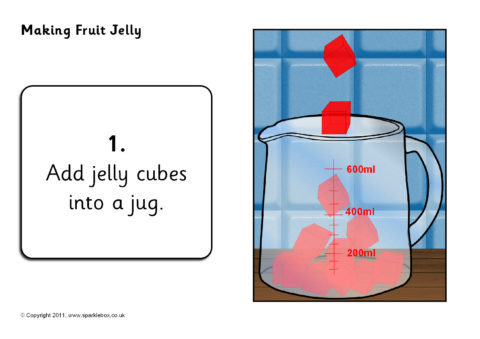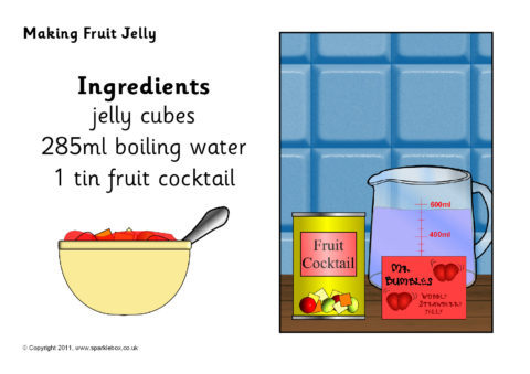 A useful set of simple visual aids showing how to make fruit jelly in 6 steps. It includes instructional text and a list of ingredients with accompanying pictures. These could be laminated and used when actually making the jelly or used for classroom displays and discussion afterwards.