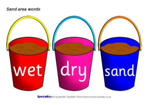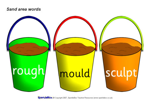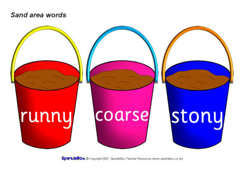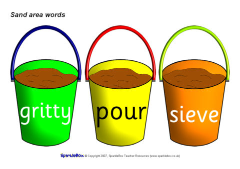 A set words linked to ‘sand’ presented on colourful bucket images. These are ideal for hanging in your sand area, or linked to a discussion on materials.