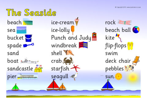 A simple A4 printable word mat with words linked to the seaside.