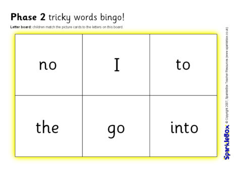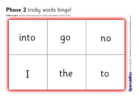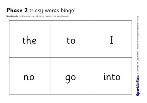 A set of bingo boards and cards featuring the six Phase Two tricky words in the DfES Letters and Sounds document.
