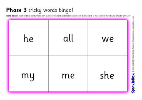 A set of bingo boards and cards featuring the twelve Phase Three tricky words in the DfES Letters and Sounds document.
