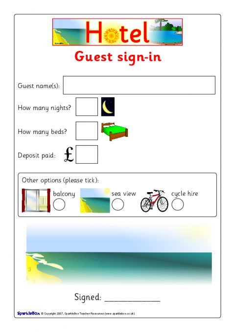 A set of resources for your hotel role-play area. Includes a banner image, 10 different label images and a ‘Guest Sign-in’ form for the ‘receptionist’ to fill in.