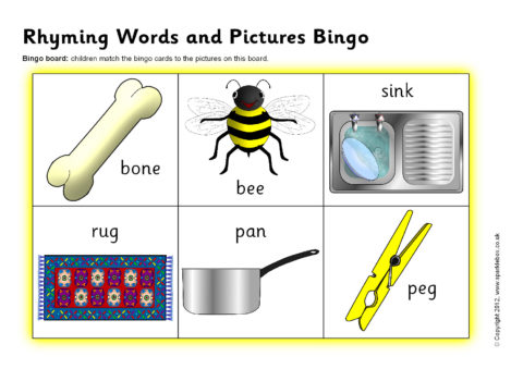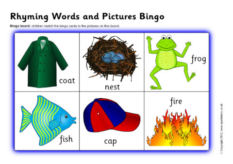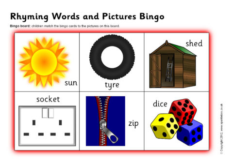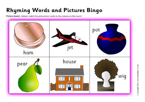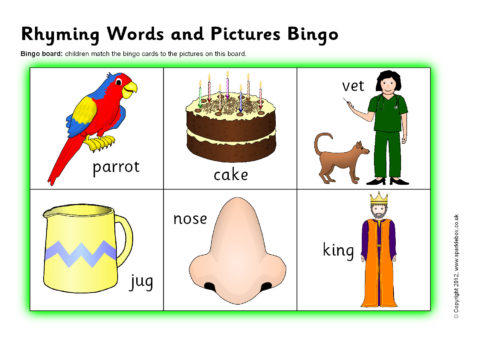 A set of printable picture/word bingo boards with accompanying rhyming pictures and words. A fun activity to reinforce rhyme - children take turns to turn over a picture/word card. If it rhymes with something on their board they can place the card over the relevant picture. The first child to fill their whole board shouts ‘Bingo!’.