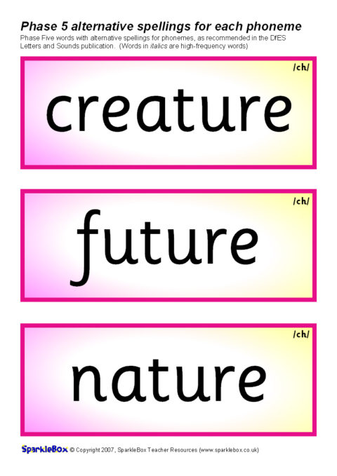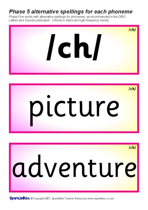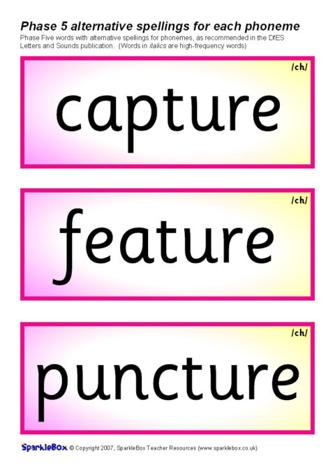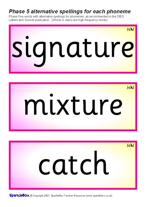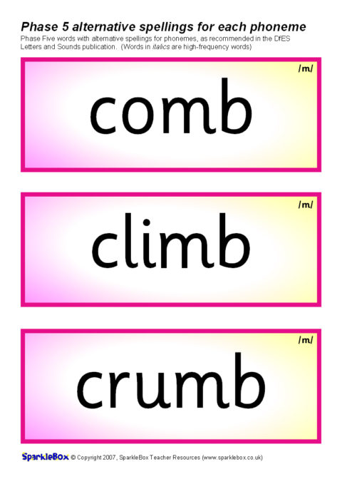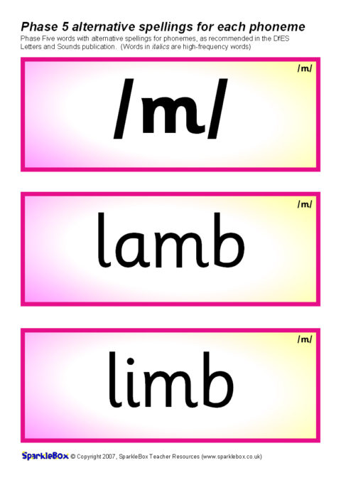 A set of over 400 printable cards (3 per A4 sheet) featuring the suggested words and alternative phoneme spellings from the DfES Letters and Sounds publication. Ideal for use in classroom word banks, for reading activities and also to compliment the activities suggested in the Letters and Sounds document.