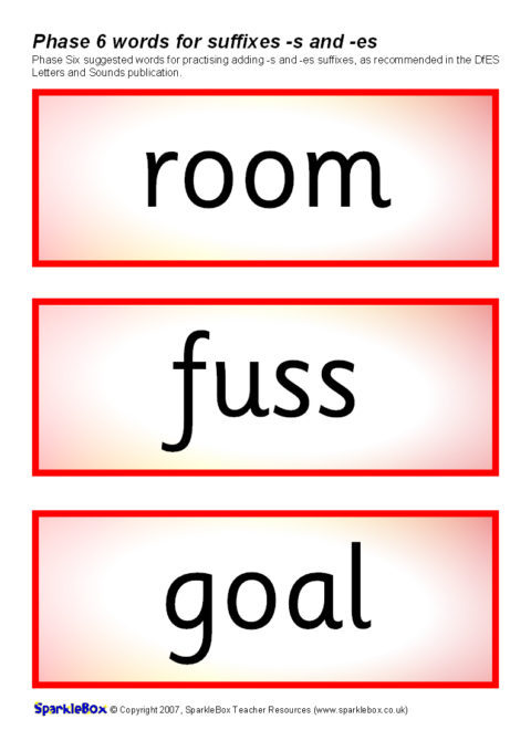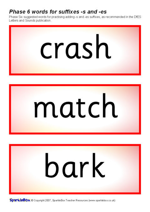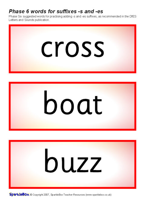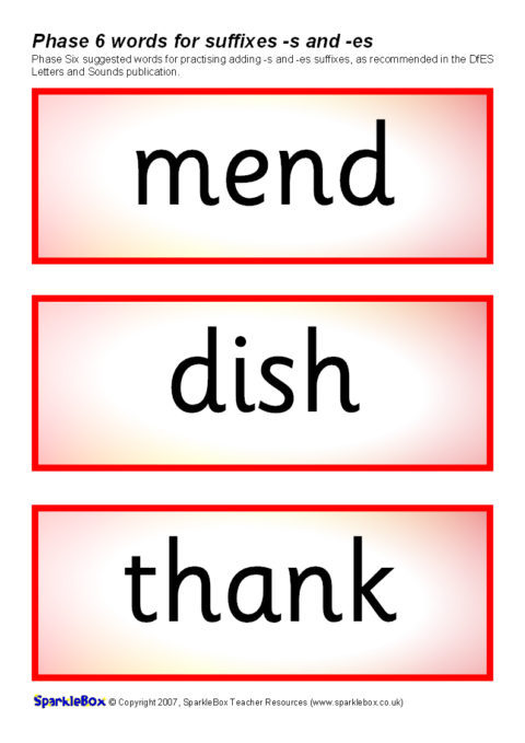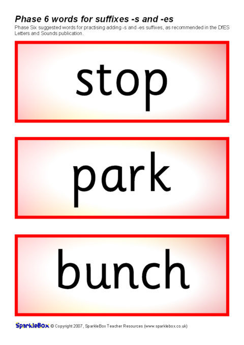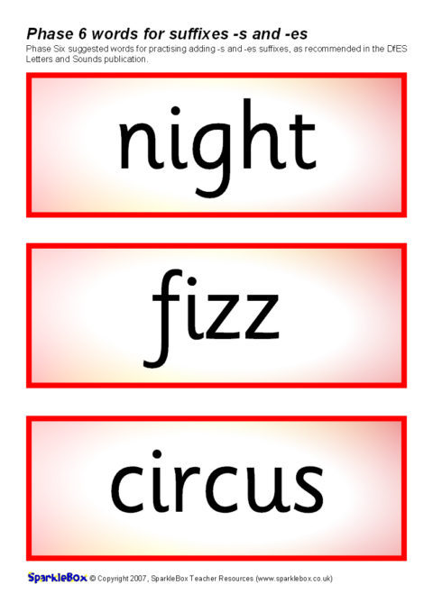 The suggested words for Phase Six practising adding the suffixes -s and -es as outlined in the DfES ‘Letters and Sounds’ publication. 30 words included!