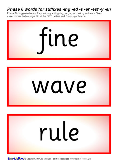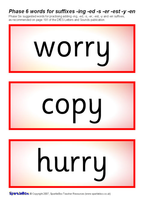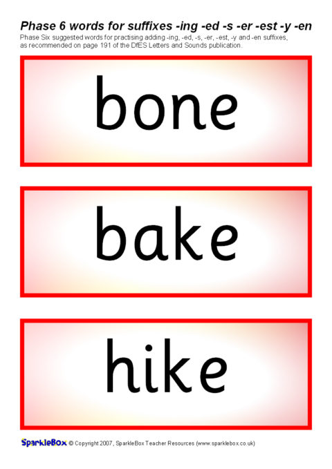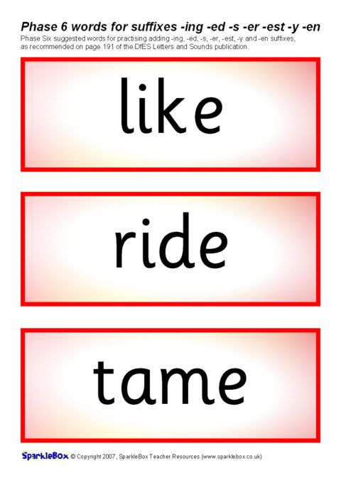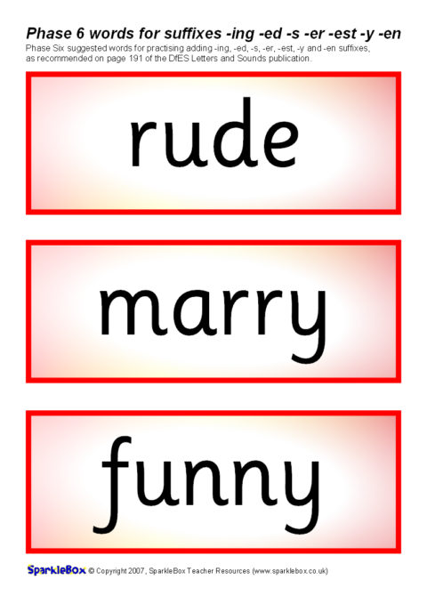 The suggested words for Phase Six practising adding the suffixes -ing, -ed, -s, -er, -est, -y and -en, as outlined in the DfES ‘Letters and Sounds’ publication.