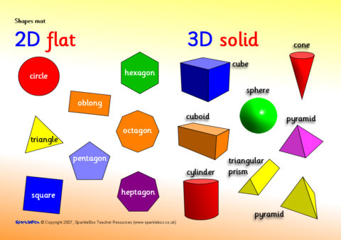 An A4-size printable mat featuring the common 2D and 3D shapes together with their names.