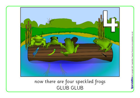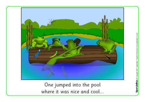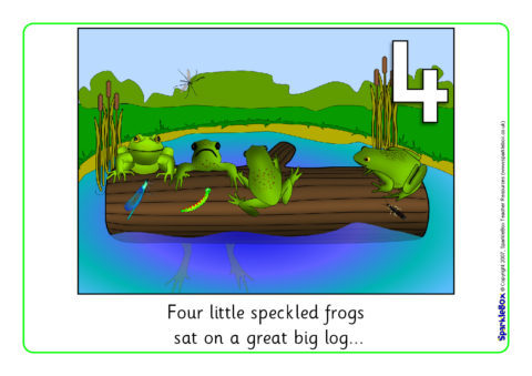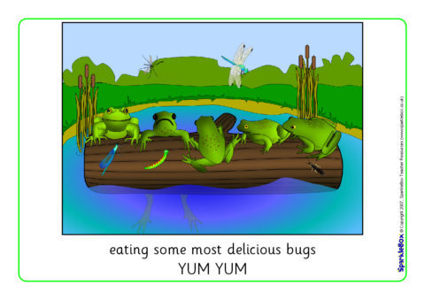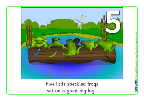 A set of colourful visual aids for use when reciting the popular number rhyme ‘Five Little Speckled Frogs’. Your class will love saying the rhyme with these visual aids! They can also be sequenced using the numbers or by counting the frogs on the log, or bugs in the pictures.