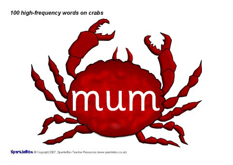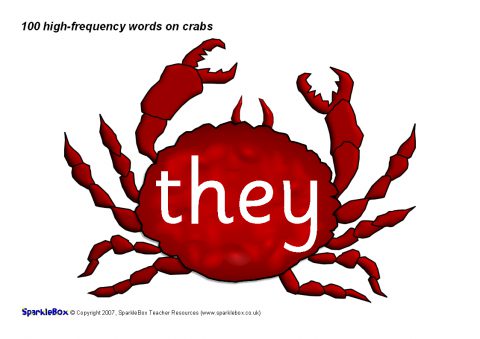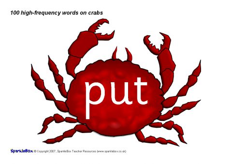 The 100 high-frequency words as specified in the DfES ‘Letters and Sounds’ publication presented on crabs. Great for a sea-themed classroom keyword display or if laminated and used for outdoor keyword hunts.