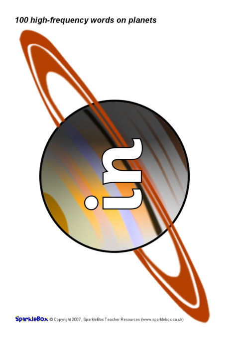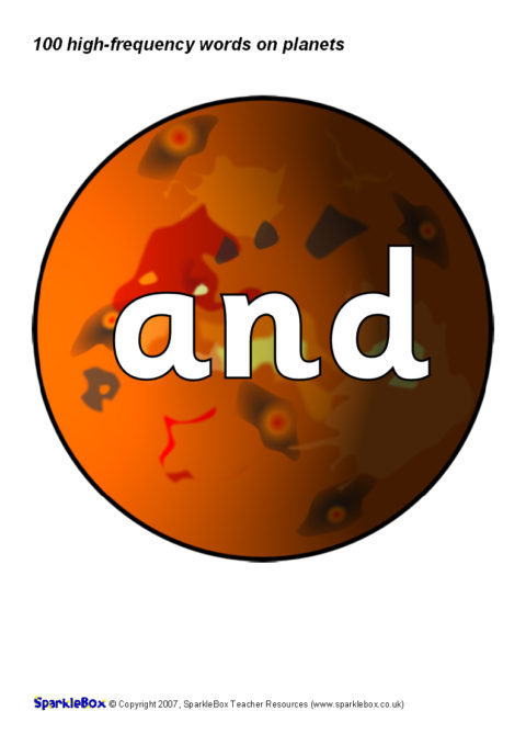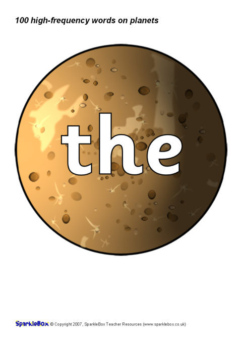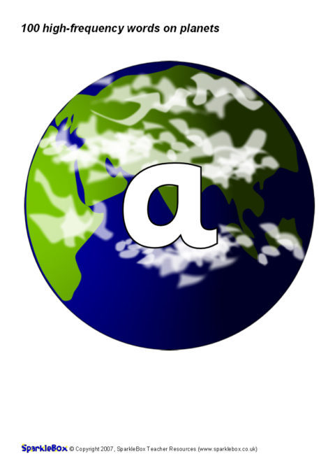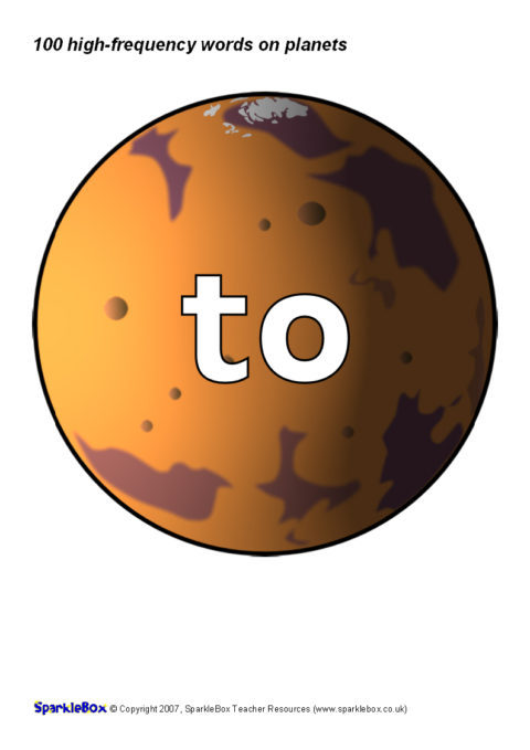 The 100 high-frequency words as specified in the DfES ‘Letters and Sounds’ publication presented on colourful planets. Great for classroom keyword displays linked to a space-theme or as large flash cards.