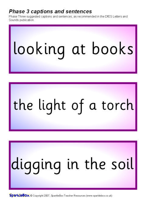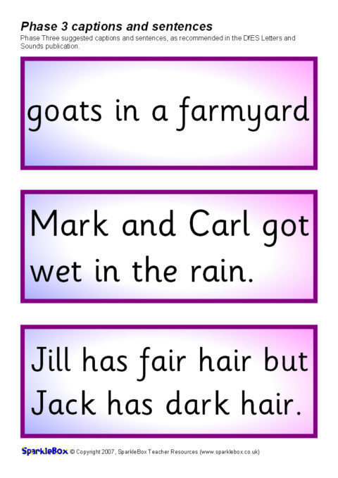 Printable cards featuring suggested captions and sentences as outlined in Phase Three of the DfES Letters and Sounds publication.