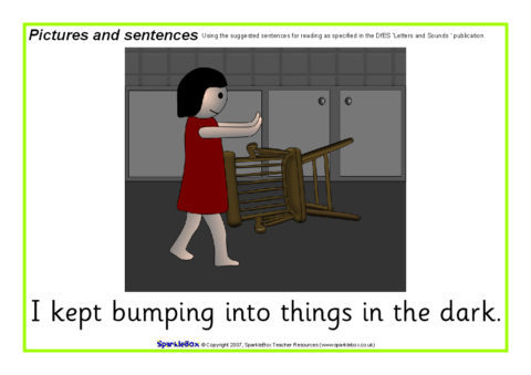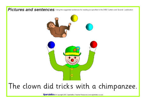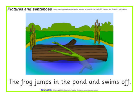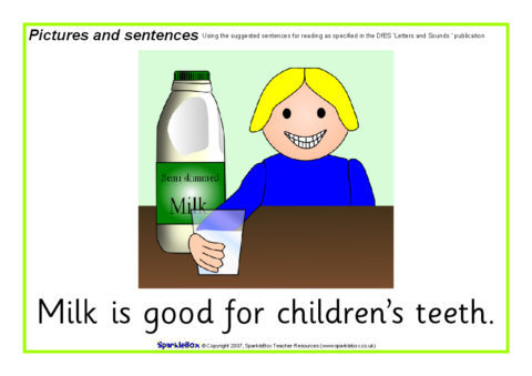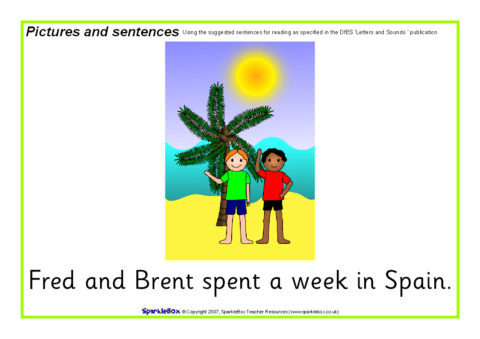 A set of 10 A4-sized visual aids showing the Phase 4 suggested sentences for reading (as outlined in the DfES ‘Letters and Sounds’ publication) along with some colourful illustrations depicting each sentence.