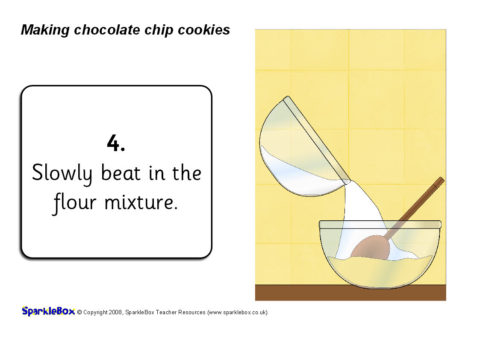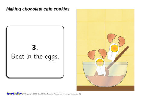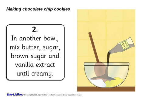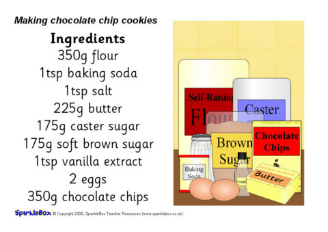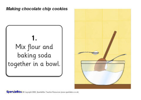 A useful set of simple visual aids showing how to make chocolate chip cookies in 9 steps.  It includes instructional text and a list of ingredients.  Also perfect for use in a classroom display.