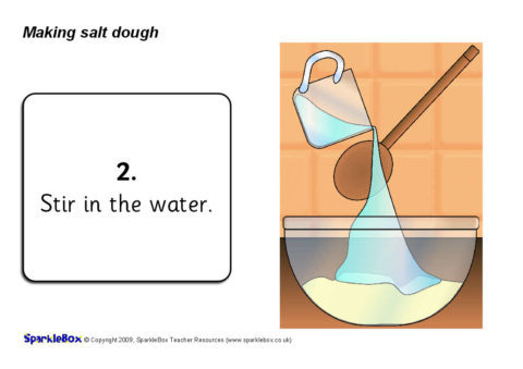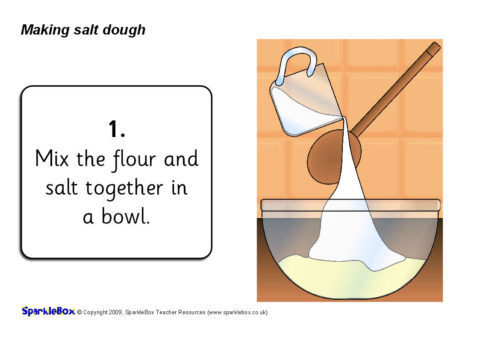 A useful set of visual aids showing how to make salt dough in easy steps.  Use salt dough to create role-play food, Christmas tree decorations, or for art projects.
