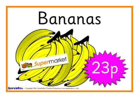 This fantastic pack includes brightly coloured posters for all sorts of products that can be found in a typical supermarket.  Also includes a Supermarket banner, printable cheque books, shopping lists, price tags and other signs.