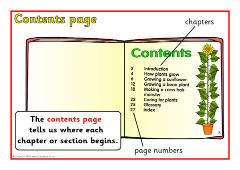 A set of posters showing different elements of non-fiction texts, including title page, diagrams, instructions, contents, glossary, index and more.