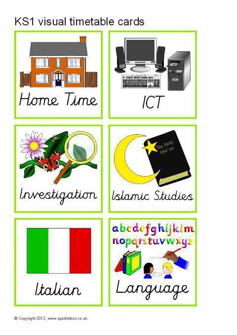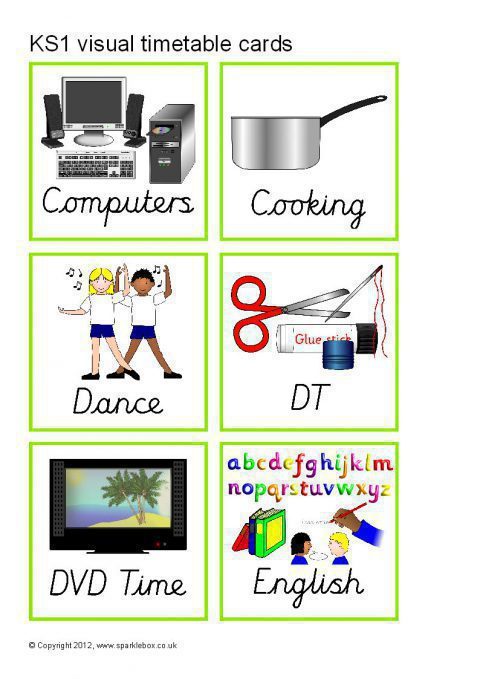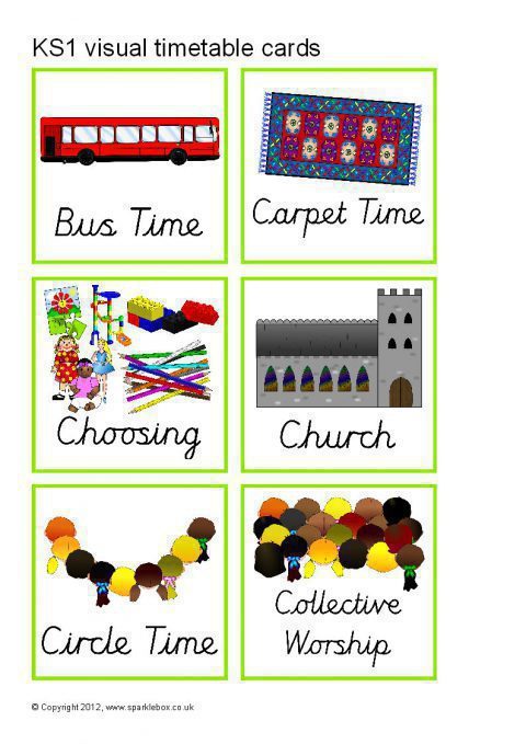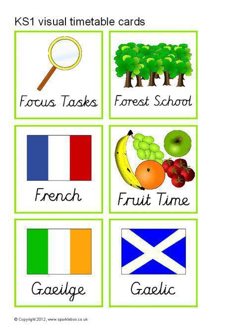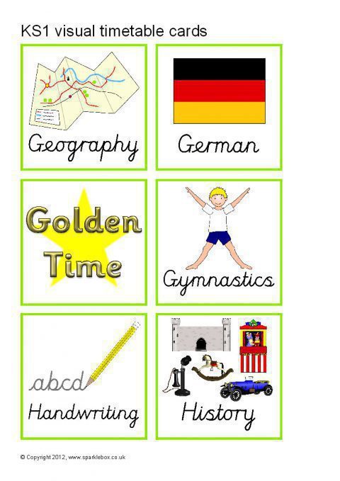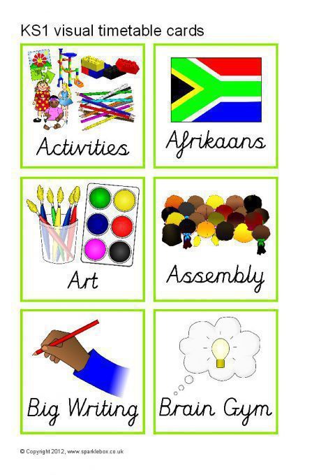 A colourful set of high-resolution JPG images featuring all of the major activities, subjects and areas of learning covered in Reception and Key Stage 1. Images can easily be resized to suit your needs. The download also includes a PDF document with the timetable images pre-arranged 6 to a page (A4).