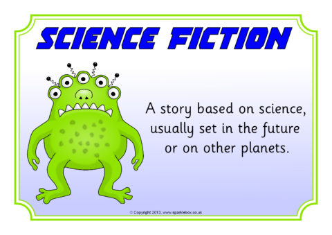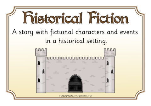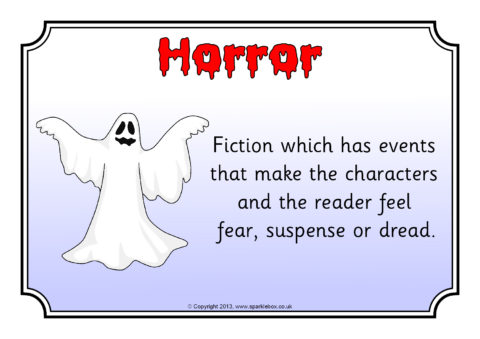 A set of posters with definitions of the main fiction genres including Historical Fiction, Humour, Romance, Science Fiction, Adventure, Horror and more.