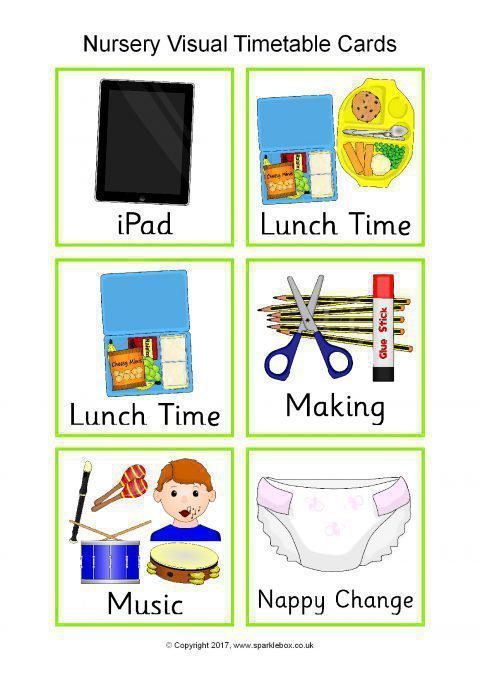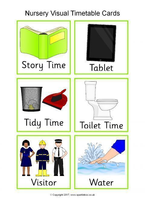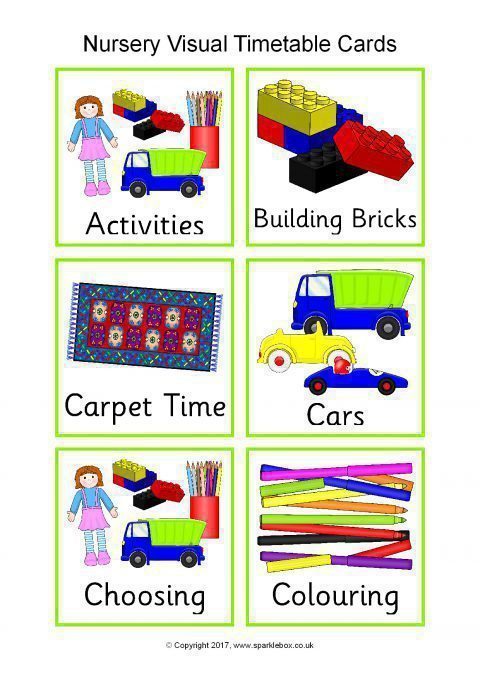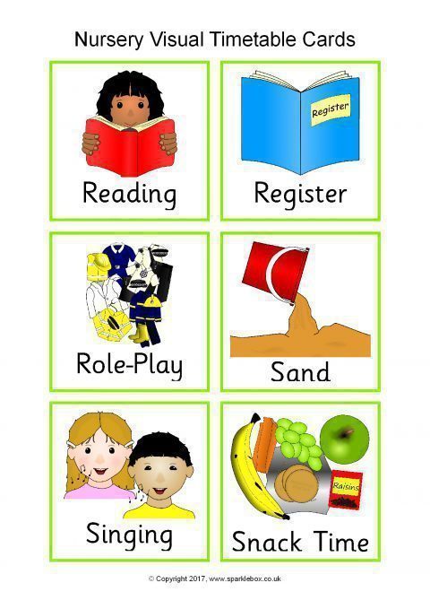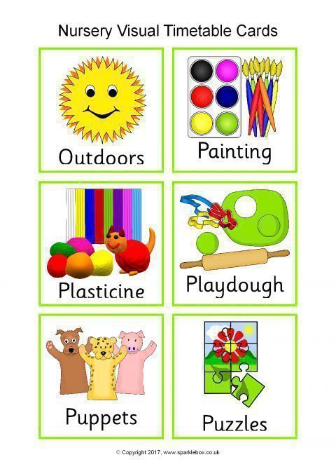 A colourful set of high-resolution JPG images featuring the main activities that children do within a nursery setting. Images can easily be resized to suit your needs. The download also includes a PDF document with the timetable images pre-arranged 6 to a page.