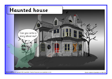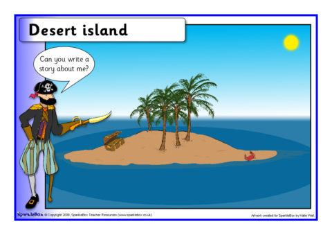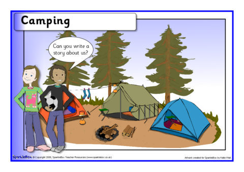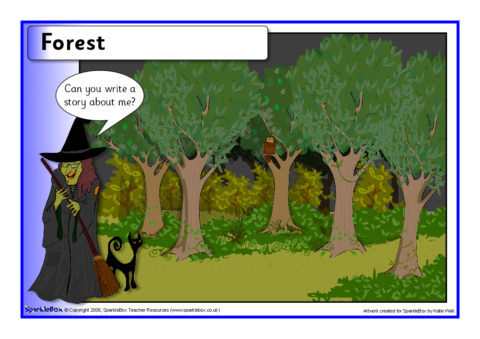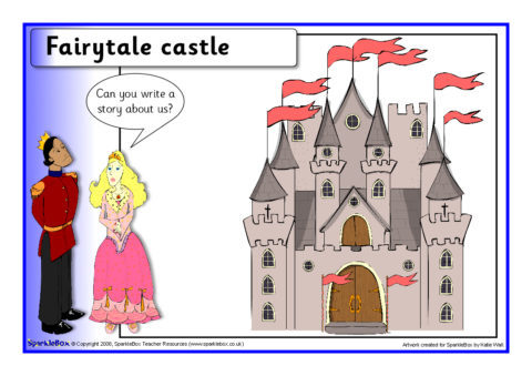 A set of 16 A4-sized posters featuring story settings and characters as prompts for children’s writing.