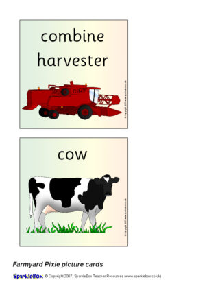 Multi-use printable cards with pictures and words related to a typical farmyard