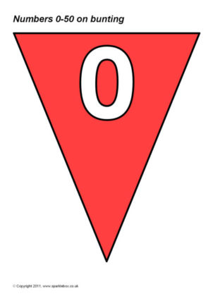 The numbers from 0 to 50 presented on printable multi-coloured bunting