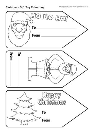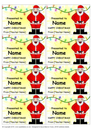 A set of editable Christmas-themed gift tags sticker templates (8 stickers per A4 page) designed to be printed on Avery Labels J8165
