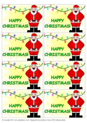 A set of gift tag sticker templates with a Christmas theme (8 stickers per A4 page) designed to be printed on Avery Labels J8165