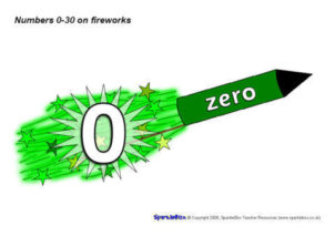 The numerals and number-words from 0-30 presented on colourful fireworks