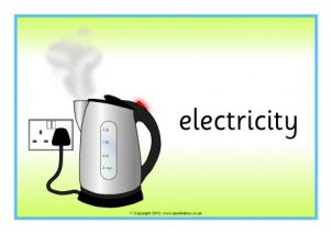A set of posters showing various types of renewable and nonrenewable energy sources and other items related to domestic energy use