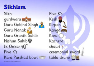 A printable word mat featuring words and pictures linked to the Sikhism faith