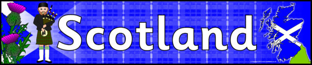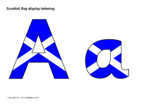 A PDF document with 26 Scottish flag-themed alphabet letters (upper and lowercase)