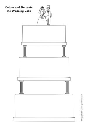A set of pages with blank wedding cakes for children to colour and decorate