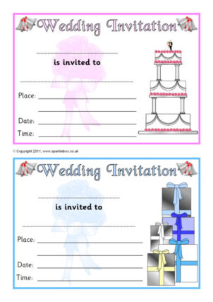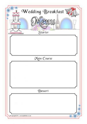 Printable wedding breakfast menu templates (colour and black and white) for pupils to write their own starters, mains and desserts