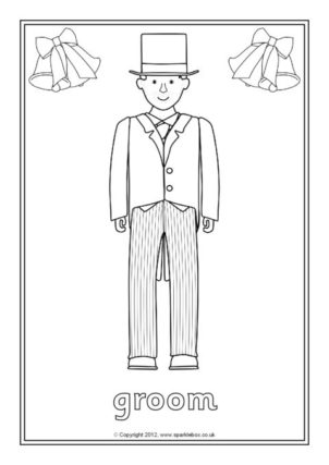 A set of colouring pages with pictures of things associated traditional Christian weddings