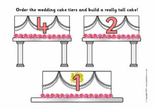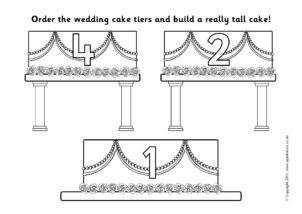 Children cut out the wedding cake tiers and order them to make a cake with either 10 or 20 tiers