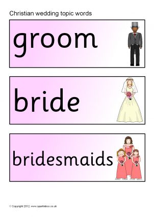 A printable set of word and picture cards featuring people and objects found at a traditional Christian church wedding