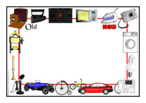 Portrait and landscape A4 page borders with images of everyday objects past and present