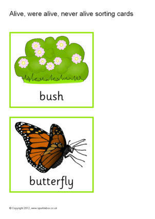 A set of printable cards for children to sort into items that are alive, were alive and have never been alive