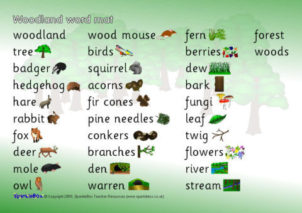 A simple A4 printable word mat with words and pictures linked to woodland areas