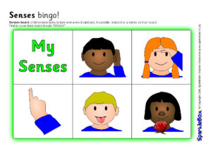 A fun bingo game where children match the descriptive words and pictures to the five senses pictures on their bingo board