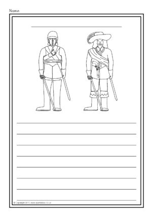 A set of simple printable sheets featuring images of things associated with the English Civil War for children to colour along with writing lines for topic-related writing