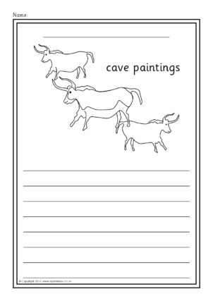 A set of simple printable sheets featuring images of items associated with Prehistoric Britain for children to colour along with writing lines for topic-related writing